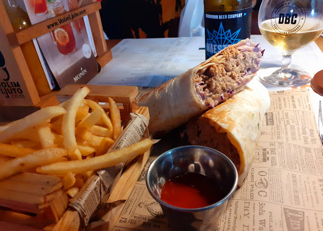 Olin haikaillut pizzaa, josta olisi riittänyt myös iltapalaksi, mutta valitsinkin kanawrapin Konoba Zrinskin listalta. Ja reissun ensimmäinen Tomislaw! Olikin hyvä ruoka, muistaakseni olemme tarjonneet Zeljkalle yhden illallisen samassa paikassa.